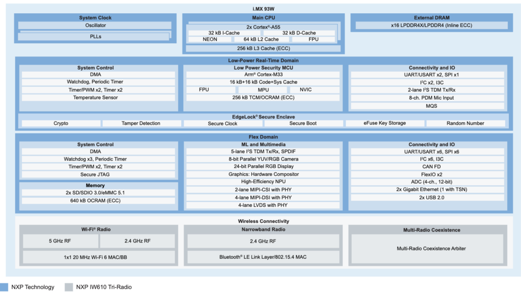 NXP Semiconductors has introduced the i.MX 93W, an applications processor. Purpose-built to accelerate physical AI deployment, the device integrates a dual-core Arm Cortex-A55 with a dedicated Arm Ethos NPU (up to 1.8 eTOPs) and an IW610 tri-radio module supporting Wi-Fi 6, Bluetooth LE, and 802.15.4 (Matter/Thread) in a single package, replacing up to 60 discrete components.