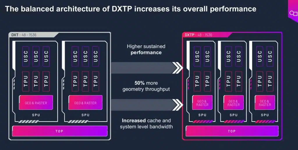 The DXTP provides 64 GPixel/s, 2 TFLOPS FP32, and 8 TOPS INT8 in a parallel compute engine running at 1GHz. It comes in two off-the-shelf configurations and has been licensed for mobile and automotive use. The GPU features hardware-based virtualization technology for secure GPU multitasking and can run graphics and compute operations simultaneously with minimal overhead.