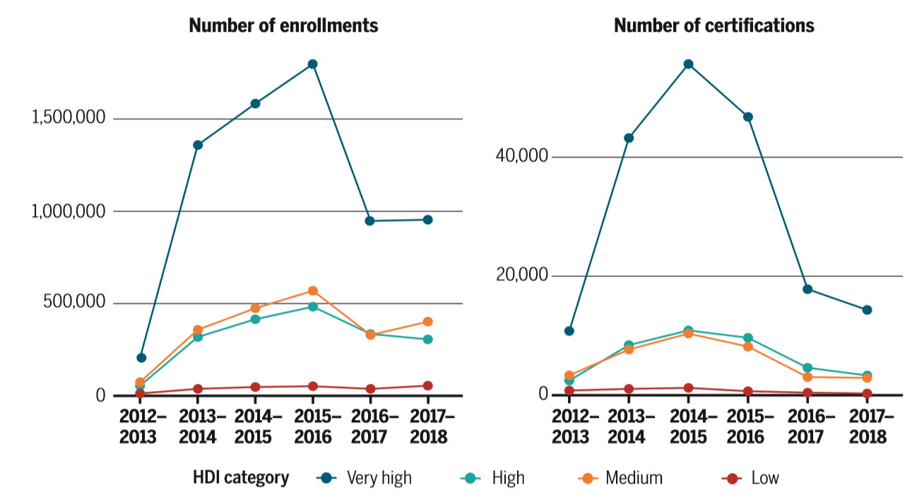 Sadly, MOOC courses often get abandoned after a few classes, and the number of certifications has decreased, with a disproportionate number of participants from affluent countries. (See Figure 1.)