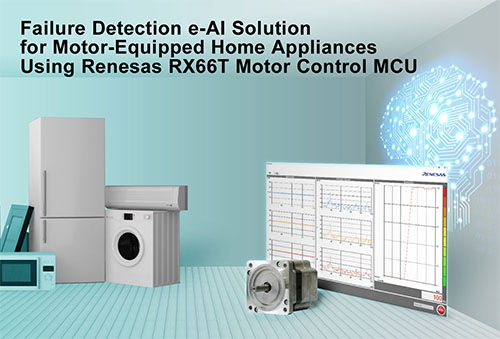 Renesas Electronics Corporation announced the launch of its Failure Detection e-AI Solution for motor-equipped home appliances, featuring the Renesas RX66T 32-bit microcontroller (MCU). This solution with embedded AI (e-AI) enables failure detection of home appliances — such as refrigerators, air conditioners, and washing machines — due to motor abnormality. Property data showing the motor’s current or rotation rate status can be used directly for abnormality detection, making it possible to implement both motor control and e-AI–based abnormality detection with a single MCU. Using the RX66T eliminates the need for additional sensors, thereby reducing a customer’s bill of materials (BOM) cost.