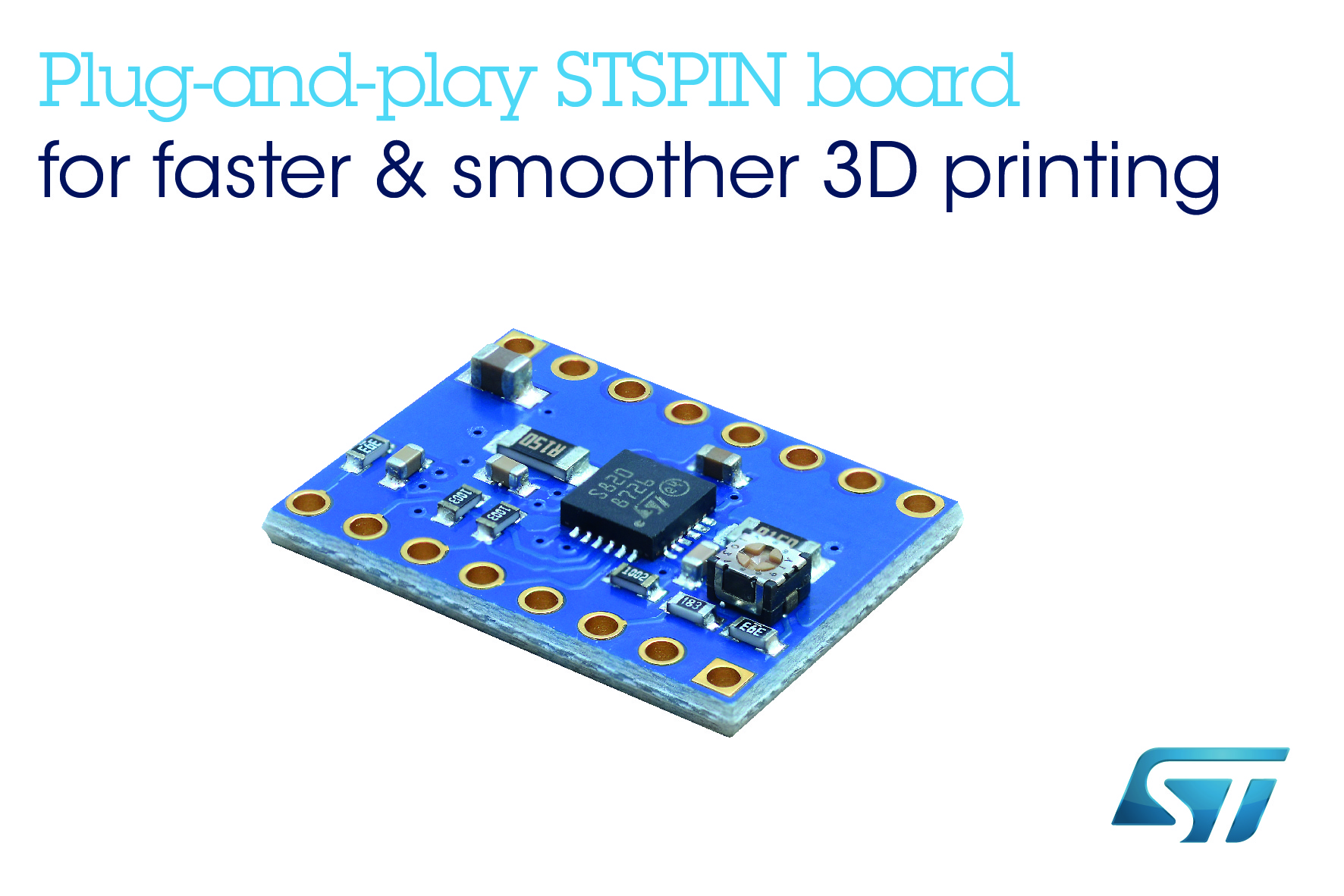 As a plug-and-play expansion board, ST’s EVALSP820-XS can drive RAMPS printers at an unprecedented speed for greatly increased throughput ensuring superior smoothness with microstepping resolution from ½-step to 1/256-step per microstep.