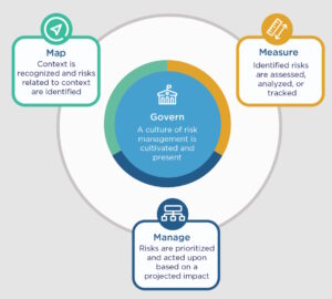 The NIST AI Risk Management Framework (AI RMF), on the other hand, is a structured, voluntary approach to AI governance without a specific focus on PAI. It’s designed to complement cybersecurity frameworks and adds specific AI risks. It takes a lifecycle approach and includes recommendations related to governing, mapping, measuring, and managing AI risks (Figure 3).